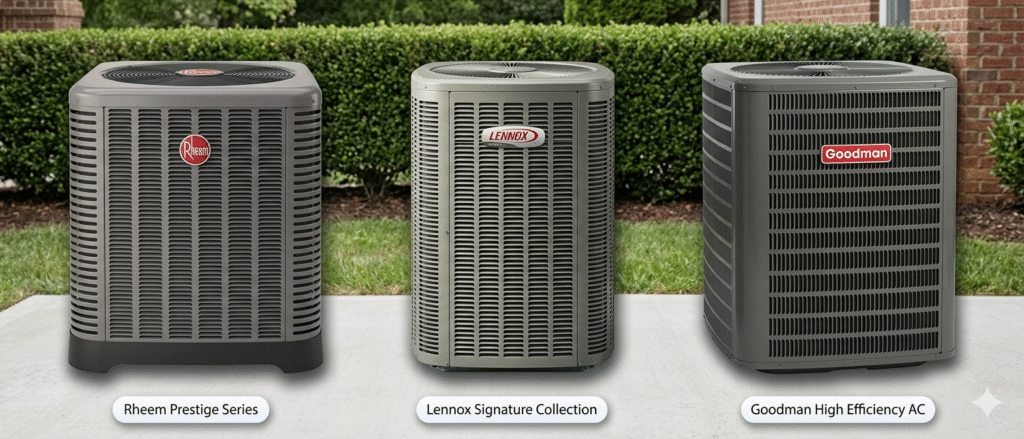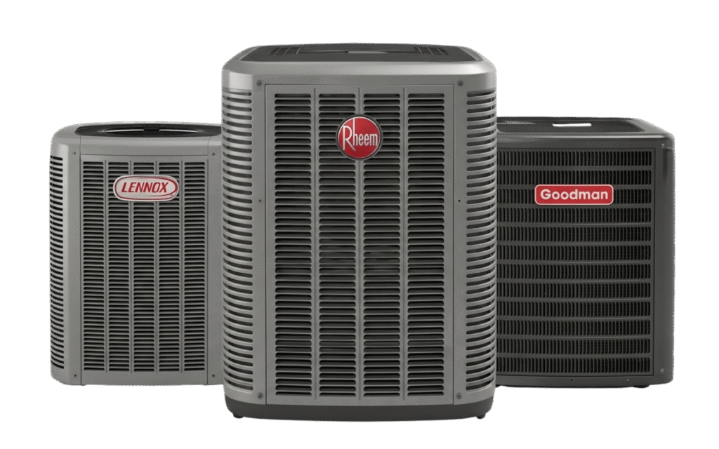 Professional air conditioner installation using high-efficiency Rheem, Goodman, and Lennox systems.